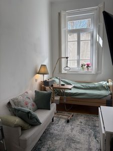 Az első emeleten található a betegszoba részleg. Itt azon lakókat helyezzük el, akik szorosabb ápolói figyelmet igényelnek. Ezen az emeleten 5 db egyágyas, 1 db kétágyas és 3 db három ágyas fürdőszobával rendelkező szobákban helyezzük el gondozottainkat.